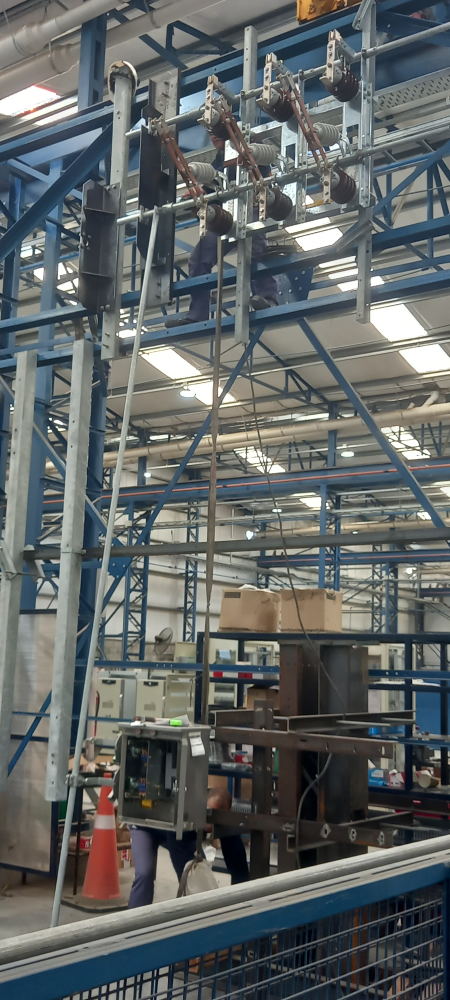 Figura 2. Seccionadores de media tensión de 13,2 kV para UTE. A la izquierda, sobre las mesas, se ven las cajas de comando.
