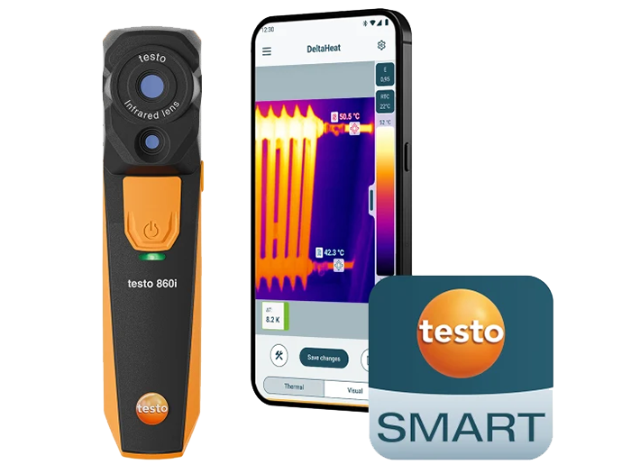 En combinación con la app testo Smart, la cámara 860i expande sus posibilidades de uso: visualización en tiempo real en el teléfono inteligente, documentación sin esfuerzo y uso compartido de informes in situ.