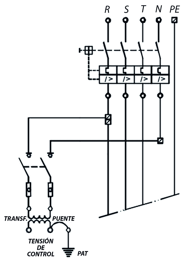 En los circuitos de las figuras de más arriba se ha colocado un puente entre uno de los bornes de la salida del transformador y la fuente de la tensión de control, más un borne próximo de puesta a tierra conectado al sistema de puesta a tierra general del edificio.