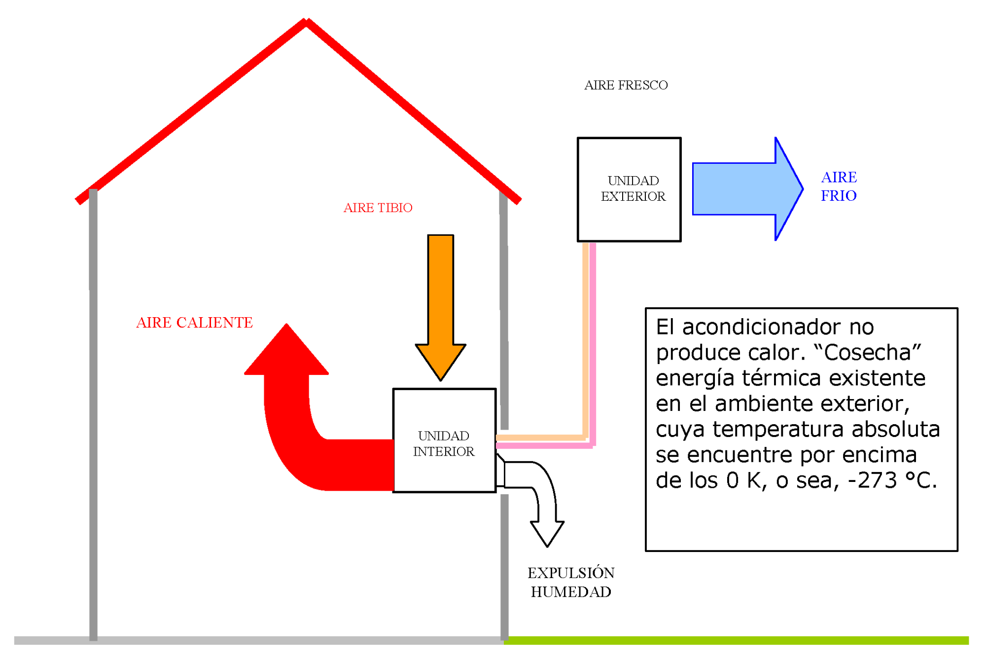 El acondicionador no produce ni calor ni frío: durante el verano, echa el calor hacia afuera (poné la mano cerca de la salida exterior: te la calienta más). En el invierno, en cambio, echa el frío (poné la mano cerca de la salida exterior: te la enfría más). En realidad “cosecha” energía existente en el ambiente por encima del cero absoluto (273 °C bajo cero). El kilowatt absorbido es el peaje que pagás por transportar energía térmica en uno u otro sentido. No confundir con el caloventor que, si bien también moviliza el aire, por cada kilowatt absorbido solamente brinda un kilowatt de calefacción y no tres (principio de la bomba de calor).
