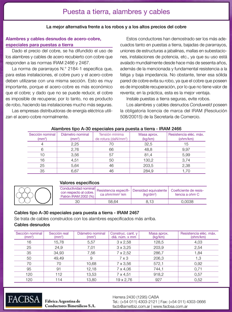 FABRICA ARGENTINA DE CONDUCTORES BIMETÁLICOS S.A. en adelante FACBSA, se ha desarrollado como una continuación industrial de A.I.S.A. empresa esta que ha sido representante exclusivo desde su fundación, en el año 1949, y por más de 40 años, de "Copperweld International Inc." de EE.UU. para las líneas de jabalinas y conductores bimetálicos acero-cobre y acero -aluminio y aluminio-cobre, y corresponsable con la firma Felten & Guillaume de la construcción del anillo de cable OF de 132 KV.del Gran Buenos Aires.