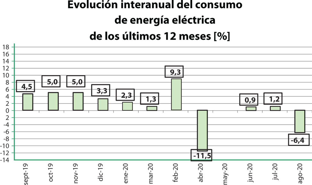 Esta caída interanual se da luego de leves ascensos en junio y en julio, precedida por una fuerte caída bimestral en abril y mayo de 2020. Aunque, existe un aumento de la demanda residencial, aún está impactando la coyuntura de la cuarentena y la menor actividad comercial e industrial. Esto se demuestra en la reducción del consumo en esos sectores de la actividad económica: