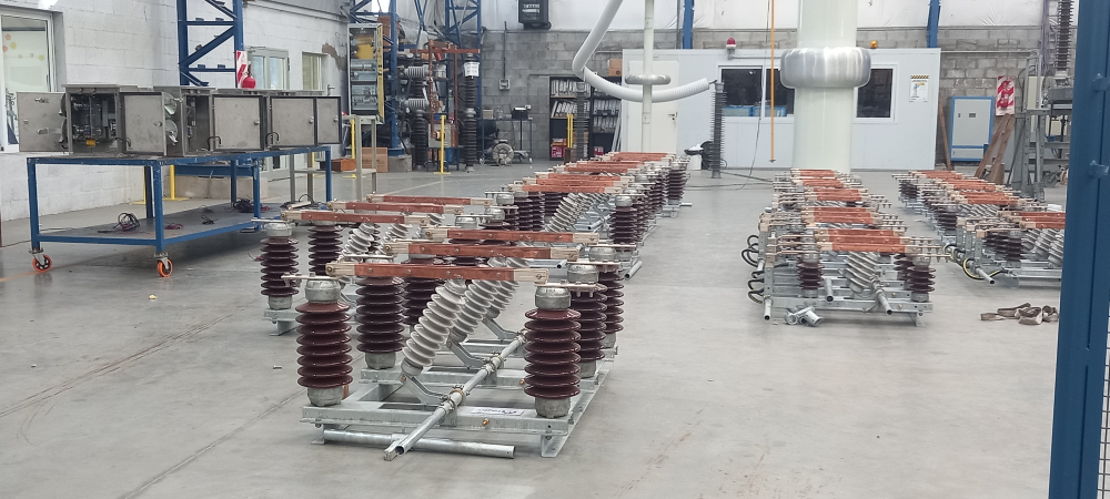Figura 2. Seccionadores de media tensión de 13,2 kV para UTE. A la izquierda, sobre las mesas, se ven las cajas de comando.
