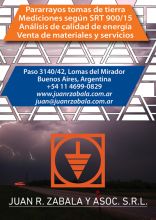 Pararrayos tomas de tierra Mediciones según SRT 900/15 Análisis de calidad de energía Venta de materiales y servicios Teléfono: +54 11 4699-0829Domicilio: Paso 3140/42Localidad: Lomas del MiradorCódigo Postal: 1751Provincia: Buenos AiresPaís: Argentina