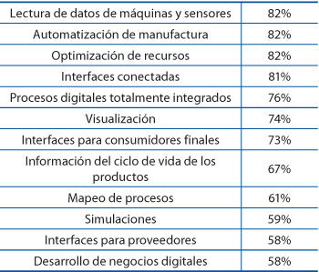Le siguen en el ranking el uso de software y aplicaciones, la computación en la nube, sistemas ciberfísicos, mundos inteligentes, aplicaciones móviles y, por último, el big data y analítica avanzada.