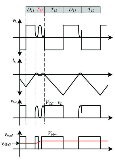 En esta sección se describe el comportamiento del CPDA cuando ocurre una falla de transistor abierto en el Puente 1. La figura 5 muestra las formas de onda de la corriente iL1, tensión vT 1 , tensión vDS en la llave S11 y vmed cuando ocurre una falla de circuito abierto en T11. En funcionamiento normal T11 entra en conducción de manera natural cuando la corriente por D11 cruza por cero. Dado que T11 se encuentra abierto, la inductancia de dispersión L y la capacitancia en paralelo con el transistor (por ejemplo, la capacitancia de salida propia del transistor) forman un circuito resonante, produciéndose una oscilación que causa un incremento en el valor medio de vDS. Además, dada la imposibilidad de circulación por T11, iL1 posee ahora una componente de continua. La figura 5 también muestra los intervalos de conducción de cada semiconductor de la pierna S11 − S12.