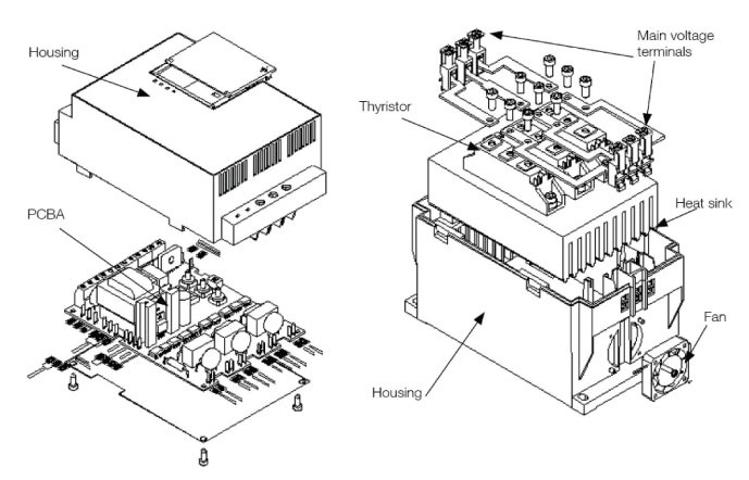 El arrancador suave se compone de unas pocas partes. En primer lugar tenemos a los tiristores (SCR), que son los responsables de regular la tensión aplicada al motor. Luego tenemos la placa de control o printed circuit board assembly (PCBA), que es quien comanda a los tiristores. Seguimos con los disipadores y ventiladores, que se encargan de extraer el calor generado por los tiristores. Transformadores de corriente para realizar las mediciones necesarias y en ocasiones también contamos con un display y teclado.