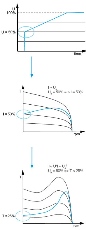 Dado que se reduce la tensión aplicada al motor durante el arranque, la corriente y el torque también lo harán. De hecho, si la tensión se reduce al 50% de la nominal, la corriente de arranque será del orden del 50% respecto de la corriente de arranque directo, y el torque se reducirá a un 25% del nominal de arranque en condiciones normales.