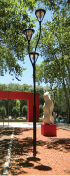 Farolas Strand modelo F194 y F294Sorprenden por su moderno diseño y líneas muy simples desde la columna en que parece como integrada hasta un techo que no sobresale de la línea de los brazos que mantienen la estructura y dan rigidez a la farola. Son de construcción muy sólida con la cubierta superior en fundición de aluminio al igual que los barrales que lo sujetan, capaces de resistir las más fuertes tormentas de nieve y granizo. Por esta resistencia mecánica fueron elegidas para iluminar la plaza San Martín en la ciudad de San Rafael, provincia de Mendoza. Un detalle no menor es la incorporación de anillos antideslumbrantes alrededor de las lámparas conformando un excelente louver. En esta obra se les incorporaron lámparas de mercurio halogenado que dan un excelente toque de luz blanca al paisaje nevado de la plaza. Farolas Strand modelo F1200Originalmente la plaza de Barrancas de Belgrano, de la Ciudad Autónoma de Buenos Aires se encontraba iluminada con columnas marca Strand modelo SDO 47/2 y farolas ornamentales marca Strand modelo F1200 equipadas con lámparas de vapor de sodio de alta presión de 250 W. Estas farolas respetan el más puro diseño colonial lo mismo que sus columnas de gran porte en fundición. |