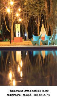 ![]() ![]() Una reflexión previaA poco que abandonamos las cunas, los humanos nos acostumbramos a la iluminación que nos provee nuestro amigo el sol: luz cálida, casi permanente, desde una posición cenital, con alto nivel de iluminancia, pero con algunas radiaciones indeseables de las cuales nos tenemos que proteger. Encontramos tan agradable la vida al sol que muchas veces deseamos prolongar esas actividades en plazas, parques y jardines, durante la oscuridad sobre todo en las noches primaverales, y en estos casos viene en nuestra ayuda la iluminación artificial. Farolas Strand modelo FMSon especialmente indicadas para casos de condiciones climáticas severas ya que resisten inclusive granizadas de gran volumen, pues su techo de aleación de aluminio fundido de calidad controlada le da una característica especial. Se proveen con un louver o persiana que difunde la emisión directa de la lámpara y aumenta subjetivamente el tamaño de la fuente de luz evitando encandilar a las personas en caso de visión directa de la farola. También llevan una cubierta inferior en policarbonato que asegura un excelente cierre alrededor de la lámpara para que no penetren los insectos. En el caso de la ciudad de Tapalqué, donde se utilizaron estas farolas en su recientemente remodelado balneario en la zona de descanso, se las proveyó con lámparas de sodio de alta presión con luz dorada que tiene la virtud de una menor atracción de insectos.