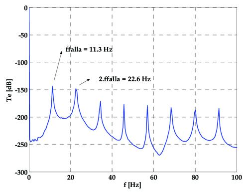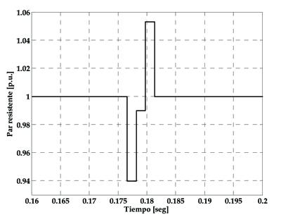 Resumen Durante las últimas décadas se ha avanzado en el desarrollo de técnicas no invasivas de detección de fallas en motores de inducción. Como complemento a estos adelantos, se ha notado la posibilidad de detectar, a través de la medición de las variables eléctricas del motor, fallas en reductores de velocidad o anomalías en la carga accionada que podrían deberse al funcionamiento defectuoso de alguno de sus componentes. Palabras claveDetección y diagnóstico de fallas, fallas en engranajes, estimador de par. 1. Introducción Los motores de inducción trifásicos de jaula de ardilla están presentes en la inmensa mayoría de los accionamientos empleados en procesos industriales. Su bajo costo y robustez los convierten en una alternativa prácticamente excluyente para dicho tipo de aplicaciones. Si bien estos motores presentan una probabilidad de falla mucho menor a la de otros tipos de máquinas, los altos costos asociados a paradas imprevistas en líneas de producción han forzado el desarrollo de una gran variedad de técnicas de detección temprana de fallas. Figura 1. Descomposición de las fuerzas de ataque sobre una transmisión entre piñón y corona con tres dientes en contacto2. Modelo de transmisión por engranajes con falla en un diente Para estudiar técnicas de detección de fallas en trenes de engranajes, se considera necesario contar con un modelo que permita predecir el comportamiento del conjunto formado por motor-reductor-carga ante una anomalía en uno de los dientes en el reductor. Para ello se parte de la hipótesis de que la rotura o el desgaste de un diente, tanto del piñón como de la corona, introduce una perturbación en el par que el piñón transmite sobre esta última. En efecto, la ausencia o desgaste de un diente exigirá que los otros dientes del piñon que se hallan en contacto con la corona modifiquen su fuerza de contacto para compensar los cambios que se producen en el sistema de fuerzas tangenciales sobre los dientes. (1) βc = 360°/zc donde zc es el número de dientes de la corona. El par transmitido a la corona, por consiguiente, estará dado por el aporte de las tres fuerzas tangenciales, esto es: (2) Tc = FpRc [cos (α + βc) + cos (α) + cos (α − βc)] donde Rc es el radio primitivo de la corona. Se desprende de la figura 1 que en realidad el radio de aplicación de las fuerzas sobre cada diente no es exactamente Rc. En efecto, solo la fuerza aplicada por el diente 2 del piñón actúa sobre la corona exactamente con un radio Rc. Sin embargo, si se considera que generalmente el alto de un diente es mucho menor al radio de la rueda dentada, las diferencias en los radios de aplicación de las fuerzas de cada diente pueden despreciarse. De tal modo, con fines de simplificación, se toma Rc como la distancia de aplicación de las fuerzas sobre cualquier diente. Figura 2. Variación temporal de par resistente visto desde el motor para el caso de un diente defectuoso de acuerdo al modelo presentado.Para considerar un caso de falla, se supone que el diente 1 del piñón (figura 1) presenta desgaste en su flanco o bien rotura y por lo tanto no ejerce presión sobre la corona. Dado que el par resistente de la carga se considera constante, ante esta situación, la ecuación 2 deberá reescribirse sin el término que corresponde al diente d1 e igualarse al mismo par Tc dado para condición libre de falla. (3) Tc = Fpfalla Rc[0 + cos (α) + cos (α − βc)] donde Fpfalla es la nueva fuerza de presión para el caso de falla. De la ecuaciones 2 y 3 es posible deducir la relación entre las fuerzas de presión entre dientes para las condiciones con y sin falla: Por otra parte, escribiendo la ecuación 2 aplicada al piñón resulta: (5) Tp = FpRp [cos (α - βp) + cos (α) + cos (α + βp)] donde Tp es el par sobre el piñón y βp es el ángulo entre dos dientes consecutivos del piñón. Esta ecuación es válida para un sistema sin falla. Para una falla en el diente 1 de la corona, la ecuación 5 resulta: (6) Tpfalla = FpfallaRp [0 + cos (α) + cos (α + βp)] Luego, haciendo el cociente entre la ecuación 6 y la 5, y reemplazando la relación entre Fpfalla/Fp dada por la ecuación 4 se obtiene el valor que tendrá el par resistente visto desde el lado del piñón cada vez que el diente defectuoso se halla en la posición dada por d1 en la figura 1. Se considera que el tiempo en que un diente ocupa cada una de las posiciones indicadas en la figura 1 es igual al tiempo de rotación de la rueda dividido el número de dientes. (7) Tpfalla/Tp = [cos(α + βp) + cos (α) + cos (α − βp)] / [cos (α) + cos (α − βp)] La ecuación 7 permite calcular la perturbación en el par medio transmitido por el piñón cada vez que el diente defectuoso se halla ocupando la posición d1. De manera similar es posible aplicar las ecuaciones 2 a 7 a las posiciones d2 y d3 para el diente defectuoso. 3. Modelo del motor de inducción y estimador de parCon el fin de simular el funcionamiento del motor de inducción en régimen transitorio se emplea el conocido modelo basado en la transformación de Park. Este modelo se basa en el tratamiento de las variables eléctricas del motor sobre un sistema de ejes en cuadratura, generalmente denominados “ejes ficticios”, e indicados por las letras “d” y “q”. El desarrollo de este modelo deriva en las ecuaciones 8 a 15. (8) vds = pλds − λqs pθr + Rs ids En las ecuaciones 8 a 15, p representa al operador (d/dt), λ a los enlaces de flujo magnético, i a las corrientes, v a los voltajes, Rs es la resistencia por fase del estator y R’r la del rotor referida al estator. Asimismo, Ls y L’r son las inductancias de dispersión del estator y del rotor referida al estator, M es la inductancia mutua máxima entre bobinas del estator y bobinas del rotor, θr indica la posición del rotor respecto al marco de referencia fijo al estator y ω r la velocidad angular del rotor. Los subíndices d y q hacen referenci