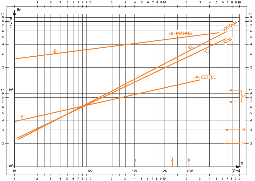 Figura 8. Nomograma bilogarítmico de la función Ec (kVc/m) = a.ρb del campo eléctrico crítico de ionización Ec del suelo alrededor de un electrodo de puesta a tierra en función de la resistividad volumétrica ρ (Ωm). Autores: Oettle, Manna, Nor, LobodaLínea: A, B, E | Valores: a, 241, 1986 y 68 kVc/m; b, adimensional 0,215, 0,214 y 0,5, y ρ, valor numérico (medida) de Ωm
