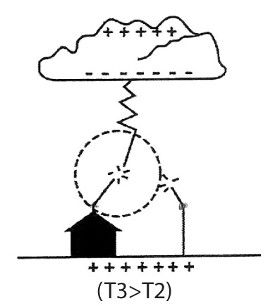 A1d. Conexión exitosa entre los líderes descendente y ascendente (instantes T3 > T2). El rayo cae en el pararrayos
