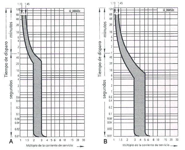 La primera de ellas (1) representa la respuesta de la protección por sobrecarga, y la segunda (2), por cortocircuitos; ambas, combinadas, ofrecen una protección completa frente a estas dos anomalías que pueden presentarse en los distintos tipos de circuitos eléctricos. Estas curvas son proporcionadas por los fabricantes, a través de los catálogos técnicos.
