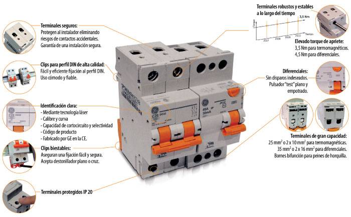 Características específicasDMS de GE: protección para las personas e instalación eléctrica del hogarLos interruptores termomagnéticos DMS están especialmente diseñados para utilizar en instalaciones domiciliarias y pequeños comercios con bajos consumos. Se utilizan para la protección de los conductores de las instalaciones eléctricas (cables) contra sobrecargas y/o cortocircuitos. En definitiva, son dispositivos que protegen a las personas de los contactos indirectos, estando las partes o componentes conductores desprotegidos de la instalación, conectados a un electrodo de tierra adecuado. Pueden emplearse para asegurar la protección contra riesgos de incendio, debido a una corriente de defecto a tierra persistente que no provoca la actuación del dispositivo de protección de sobreintensidad. Los interruptores diferenciales con una intensidad diferencial asignada no superior a treinta miliampers (30 mA), se utilizan también como elementos de protección adicionales en caso de falla del dispositivo de protección. Interruptores termomagnéticos de tres kiloamperes (3 kA) según IEC 60898-1