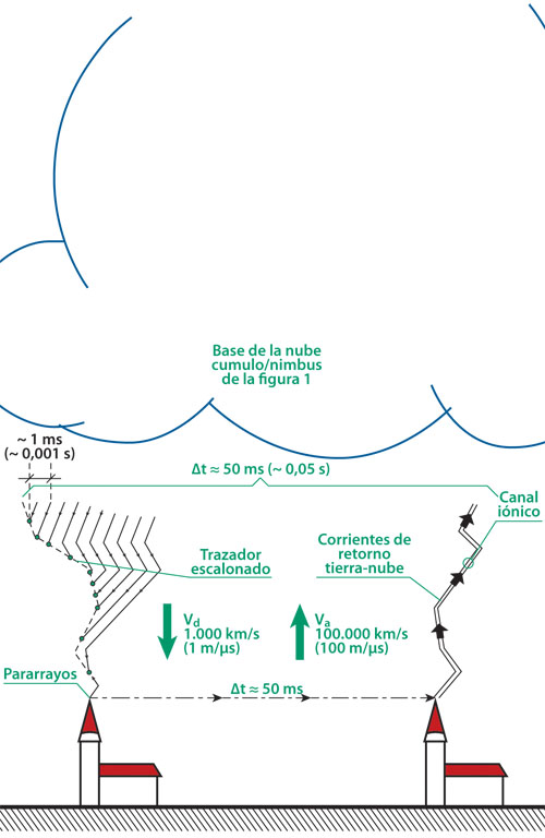 Figura 2. Caída del trazador por escalones sobre el pararrayos (izquierda) y ascenso de las corrientes de retorno (derechas desde ese mismo pararrayos hacia la nube por el canal iónico formado por el trazador por escalones) En el lenguaje común, se evoca con frecuencia “la caída del rayo”. Del espectáculo mismo que ofrece el relámpago con sus numerosas ramificaciones dirigidas hacia la tierra, parece evidente que hay una progresión hacia el suelo a partir de la nube (Ver figura 2).