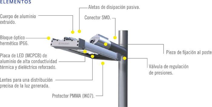 Su modulación de 24, 36 y 48 leds hace que su flujo de hasta casi 10.000 lúmenes finales del sistema completo pueda adaptarse a las necesidades de iluminación de diversos espacios, así como a varias geometrías posibles gracias a sus seis fotometrías estándar y otras seis disponibles sobre pedido.