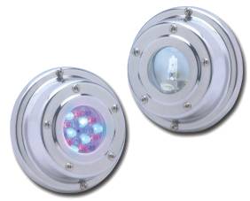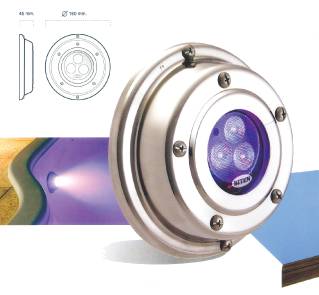 Laguna 50, luminaria subacuática para usar con lámpara bipín doce volts, cincuenta watts, con plaqueta aisladas de leds RGB o monocolor